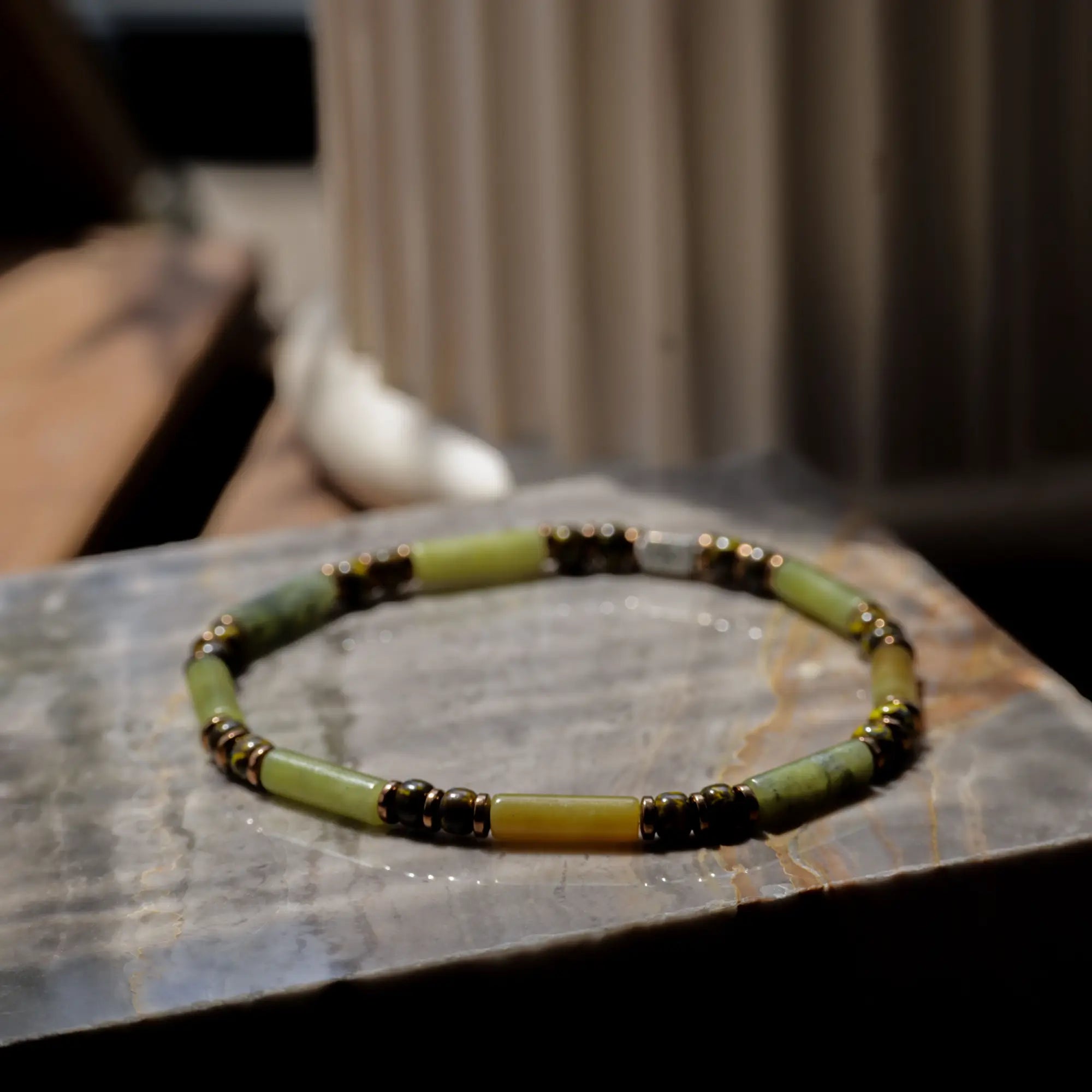 This Green Jasper bracelet has a strong, organic feel. It features a pale, translucent yellow-green stone with intricate, lighter patterns. The smooth, rich color looks natural and grounded. Green Jasper is traditionally associated with balance and stability.